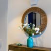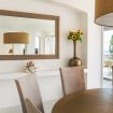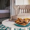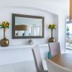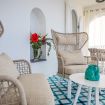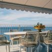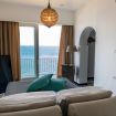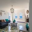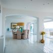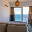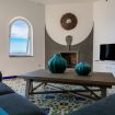 Guests are welcomed by two living rooms, each furnished with sofa sets, armchairs, Smart TVs, and decorative French windows leading to the terrace. The compact dining area comfortably seats 8 guests and features clean, bright decor with sea views.